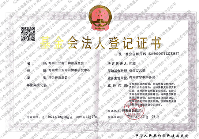 海南三亚南山功德基金会法人登记证书